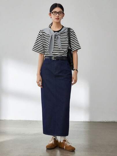 Dazy-Less تنورة جينز طويلة متوسطة للنساء بقص مستقيم عادي مغسول بطراز نقدي قديم