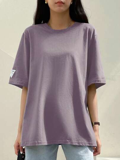 Dazy-Less تي شيرت كم قصير فضفاض مع رقعة حرفية وهيم متقسم، تي شيرت صيفي كبير الحجم