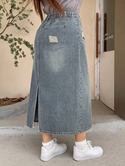 Dazy Plus تنورة جينز كحلية باهتة مخدوشة خط A لفئة الأحجام الكبيرة من الموديلات الفاخرة