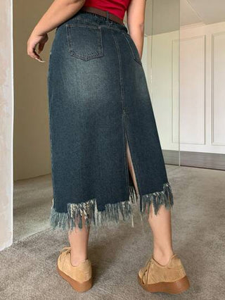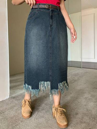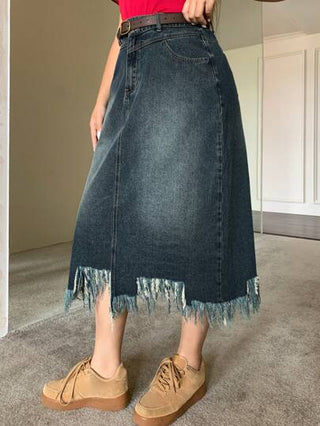 Dazy Plus تنورة جينز مشذبة مسترخية محبوكة بالكامل ذات حافة مهترئة، مناسبة لجميع المواسم