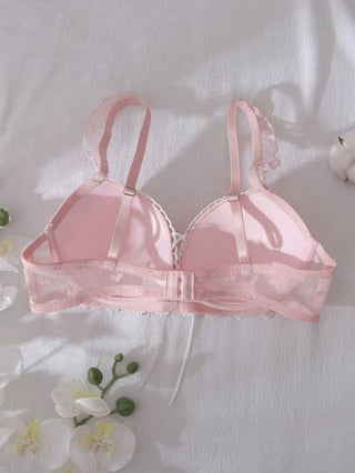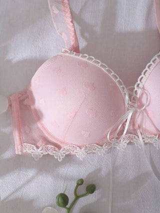 Dream Adore صدرية مدعمة بوقاية ثلاث أو أربع كؤوس مع أربطة متقاطعة، فيونكة، ملابس داخلية شبه شفافة بشكل قلب مزينة بأشرطة مطرزة وحواف مجعدة، ملابس داخلية جذابة وكاوايي للنساء، لون وردي