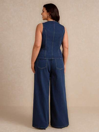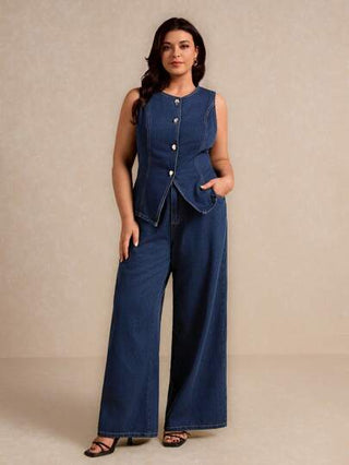 Elaquor زي بمقاس كبير من جينز مكون من قطعتين: سترة بلا أكمام وبنطال