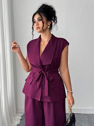Elenzga بدلة للمرأة بحجم كبير أنيقة وأنيقة، تتكون من بلوزير بياقة متقطعة، وأكمام متسعة، وسترة مع حزام، وبنطلون ذو ساقين واسعتين، مناسبة للربيع/الصيف