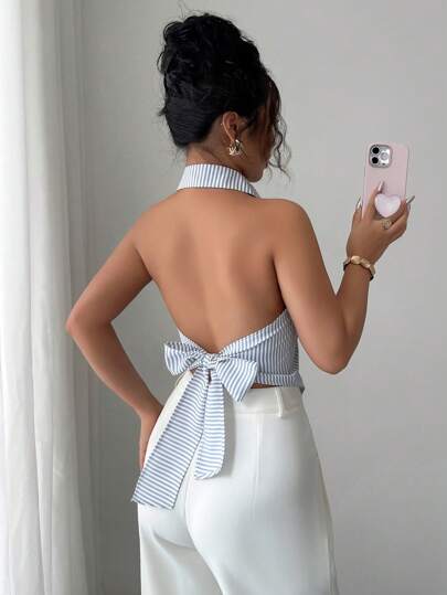 Elenzga بلوزة نسائية بطبعات عشوائية مخطَّطة مكشوفة الكتف خلفية مفتوحة