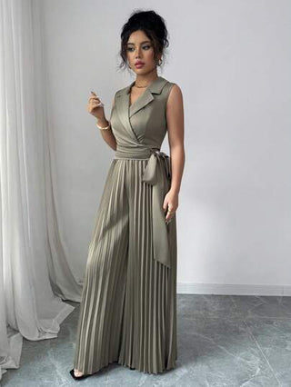 Elenzga جمبسوت موحدة طويلة للنساء بغرز عنق على شكل حرف V باللون الأخضر الزيتوني ذات خصر مربوط والتفاصيل المجمعة