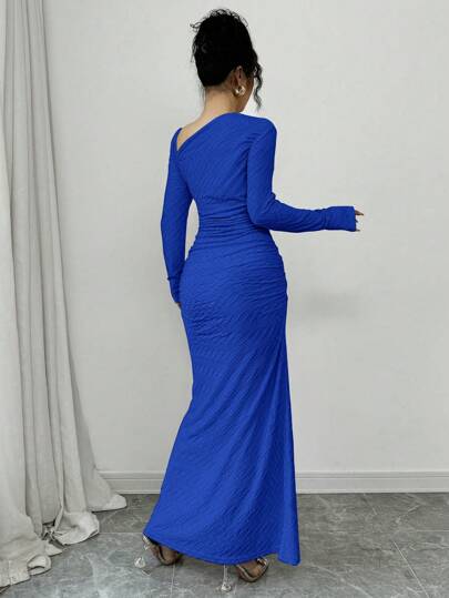 Elenzga فستان كنزة ماكسي طويل أنيق من نسيج مضغوط ملمس محبوك، مع أكمام طويلة، ياقة غير متماثلة، وخصر ملتوي على الجسم للنساء للذهاب إلى العمل