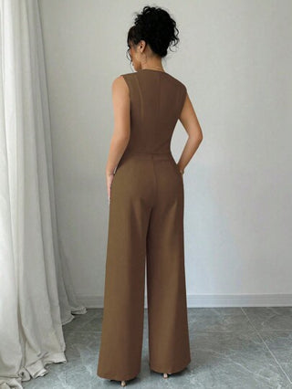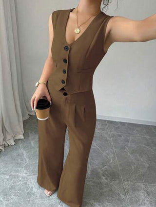 Elenzga مجموعة بلوزة كم بدون أكمام بأزرار أمامية وبنطلون من موحد اللون للنساء، بدلة رياضية عادية