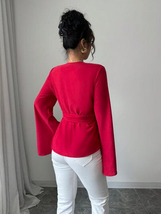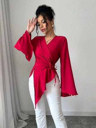 Elenzga ملابس علوية نسائية لون واحد طويلة الأكمام مزودة بربطة، طراز بسيط للارتداء اليومي العادي