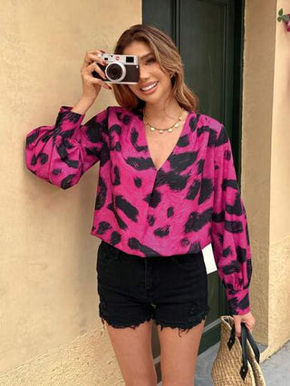 Essnce بلوزة نسائية ذات أكمام فانوس بطبعة نمر