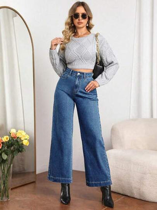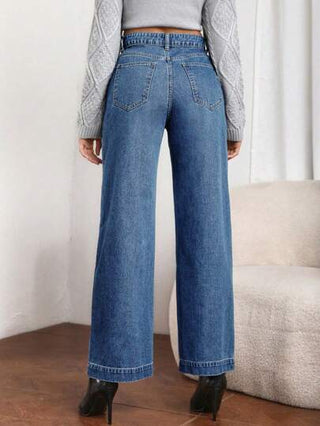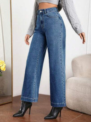 Essnce بنطلون جينز كاجوال طويل مطاطي الخصر واسع الساق مع جيوب جانبية