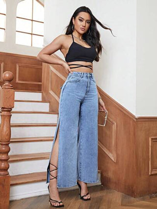 Essnce بنطلون جينز موحدة اللون فتحة للفخذ