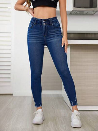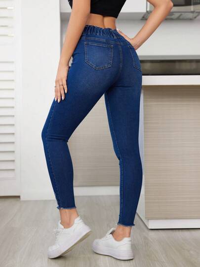 Essnce بنطلون جينز نسائي مع خصر مطاطي وطرف سفلي خام