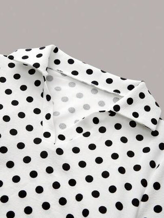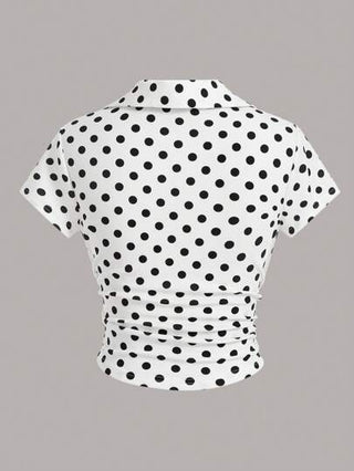 Essnce تي شيرت بولو مطوي الخصر قصير بياقة عالية وطباعة نقاط كيوت للنساء، ملابس نسائية، تي شيرت بولو قصير بنقاط، تي شيرت أبيض، تي شيرت بولو