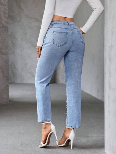Essnce جينز كاجوال مزين بخرز اصطناعي مع أزرار أمامية وجيوب متعددة للنساء