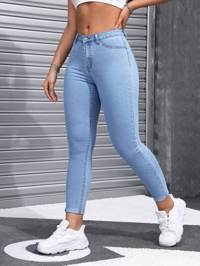 Essnce سروال جينز نحيل عارض نسائي بحافة مطوية وجيوب جانبية