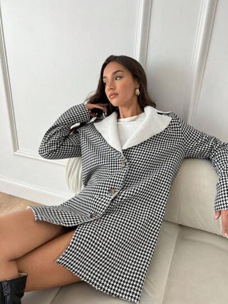 Essnce معطف طويل الأكمام فضفاض مزركش بنمط هندسي مربعات مزرر من الأمام ، معطف شتوي ، معطف تيدي ، معطف فرو ، ملابس شتوية للنساء ، معطف ، دافئ