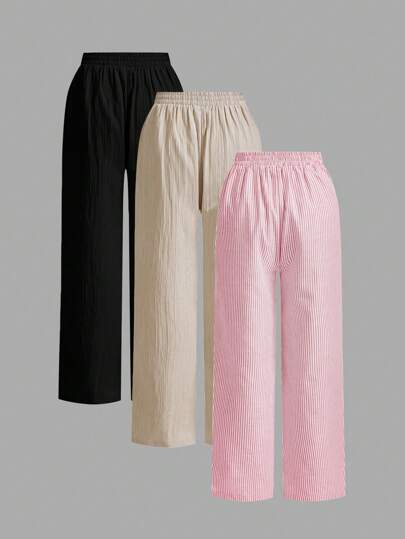 Essnce 3 قطع طقم بنطال نسائي مستقيم الساق مربوط الخصر مع جيوب، مناسب للصيف