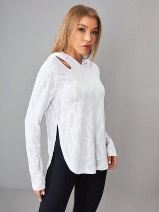 Exploreva هوودي رياضي مقطع بتفاصيل هندسية و حافة منحنية ،مجموعة ملابس التنس للنساء ، بلوزة رياضية بأكمام طويلة للخريف