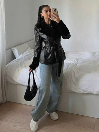EZwear جاكيت كاجوال مصنوعة من قماش PU باللون الأحادي طويلة الأكمام مع جيوب واحبال ربط الخصر