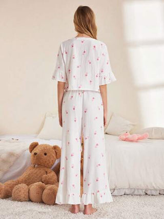 FamilyFrolics طقم بيجامة للنساء مع طبعة زهور رومانسية وكشكشة للأم والطفل