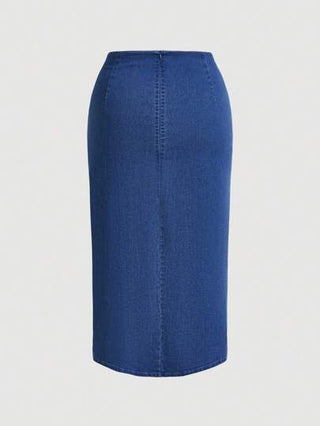 Firerie تنورة جينز قصيرة مقاس كبير، تنورة أنيقة بضلع مطوي وشق جانبي مرن بلون أزرق
