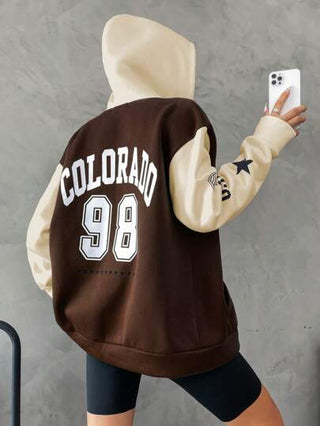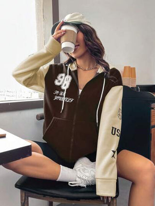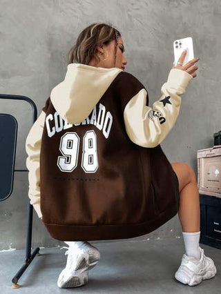 Flirla البلوفر هودي بسحاب طويل ملون مطبوع بالحروف،توب بأكمام طويلة
