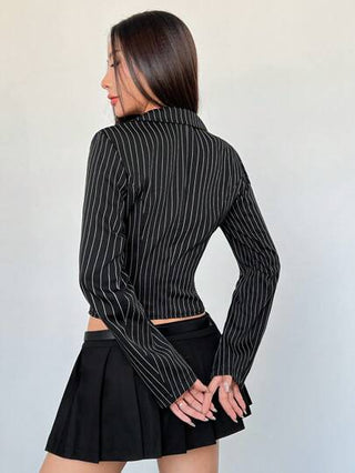 Flirla بدلة نسائية بياقة عسكرية بنمط ضيق وطويل الأكمام بخطوط سوداء وبيضاء، بقصة كاجوال عصرية