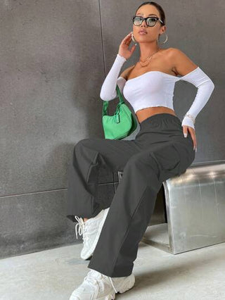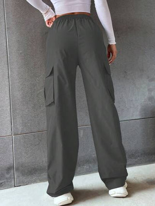 Flirla بنطلون نساء فضفاض كاجوال بجيوب حمولة ذو خصر مطاطي وساق مستقيمة بلون واحد