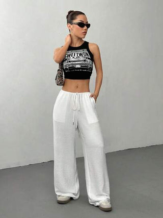 Flirla بنطلون نسائي كاجوال واسع مريح بخصر رباط