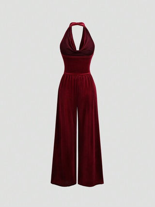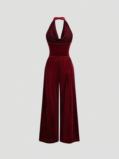 Flirla طقم جمبسوت أنيقة للنساء من القطيفة الحمراء ذات الياقة على شكل حرف V ، سترة بلا أكمام وبنطال طويل للحفلات في عيد الميلاد/رأس السنة. قياس أنيق.
