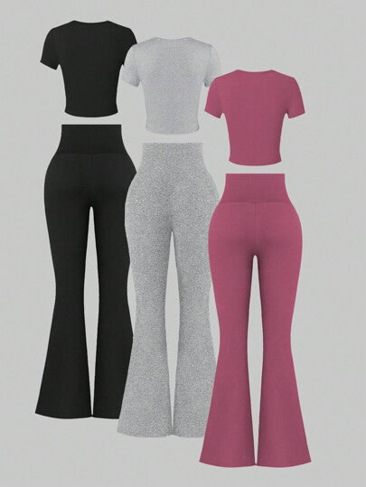 Flirla طقم كاجوال 3 قطعة/طقم، تي شيرت أكمام قصيرة رقبة دائرية وبنطلون مرتفع الخصر منفرج