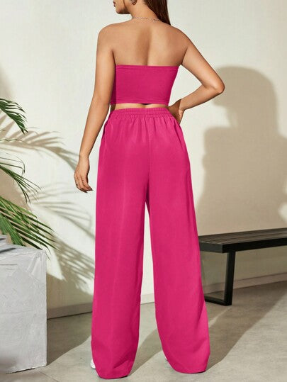 Flirla طقم ملابس علوية بلا أكتاف وبنطلون كاجوال واسع الساق للربيع/الصيف، لون وردي، بنطلون كارجو وردي، بدلة وردية للنساء، مجموعة قطعتين وردية