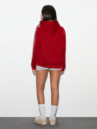 Flirla قطعة واحدة من البلوز الرياضي بتصميم عصري وعملي للسيدات, طباعة حرفية ، جيب كنغر ، لون أحمر ،مناسب للخريف والشتاء، موضة لملابس السنة الجديدة