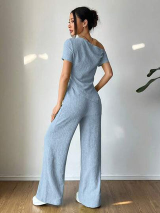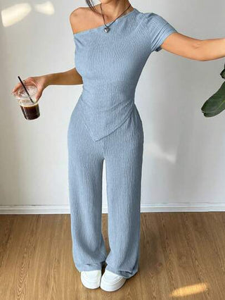 Flirla قطعتان/طقم تي شيرت كاجوال غير متماثل الكتف + بنطال واسع الساق منخفض الخصر