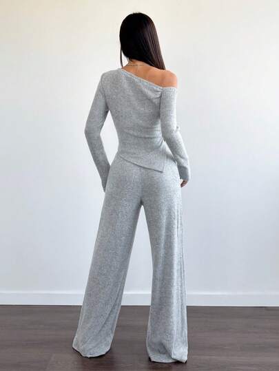 Flirla مجموعة بنطلون واسع الساق فضفاض وبلوزة كاشفة للكتف أسيمتريكية من القماش المدفأ قطعتان للنساء في فصل الشتاء