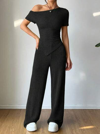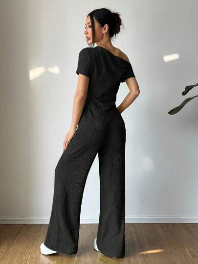Flirla مجموعة قطعتين: تي شيرت بأكتاف غير متماثلة + بنطال ساق واسعة منخفض الخصر ، ملابس منزلية عادية