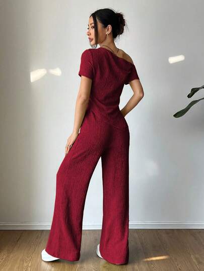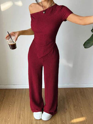 Flirla مجموعة من قطعتين: قميص كاجوال أكتاف غير متماثلة + بنطال واسع الساق ذو خصر منخفض