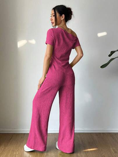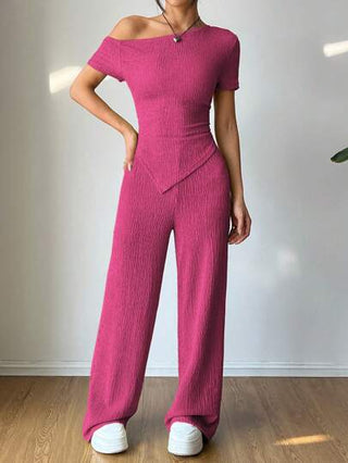 Flirla مجموعة 2 قطعة: تي شيرت بكتف غير متماثل + بنطال بخصر منخفض وساق واسعة ، ملابس منزلية كاجوال