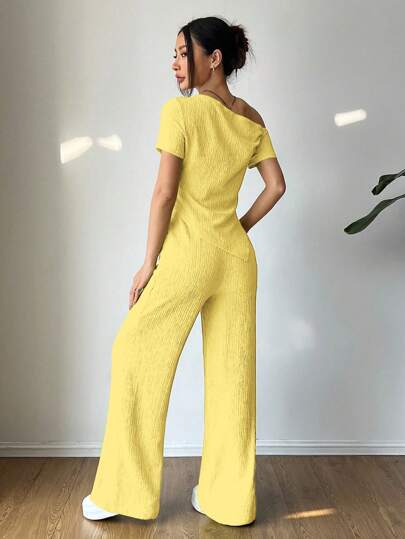 Flirla مجموعة 2 قطعة: تي شيرت كاجوال قصيرة الكتف غير متماثلة + بنطلون واسع الساق منخفض الخصر