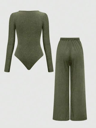 Flirla مجموعة 2 قطعة للنساء في الخريف، بيدي كاجوال فضفاض مكون من بادي أكمام طويلة ياقة مربعة واسع السراويل، طقم ألوان سادة