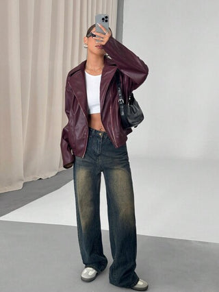 Flirla معطف جلد PU بتصميم رقعي راقي للسيدات ، بياقة وارتفاع ، بسوستة ، موضة الدراجات النارية والشارع ، للخريف