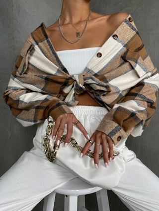 Flirla معطف طباعة مربع النقش بتفاصيل رفرف منخفض الاكتاف