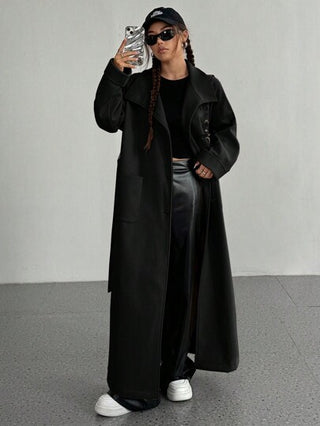 Flirla معطف ماكسي مصمم بأنوثة بقصة واسعة للياقة ذو لون أحادي بجيوب ورقعة وغلق أمامي بحزام