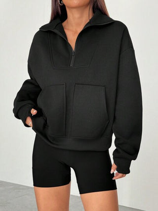 Flirla هوديSport قصير فضفاض بطول الكم،معصم أصفر بنصف سوستة،جيوب، ملابس رياضية أنيقة بتصميم بسيط ومتناسق يناسب جميع الملابس، ملائم للربيع والخريف