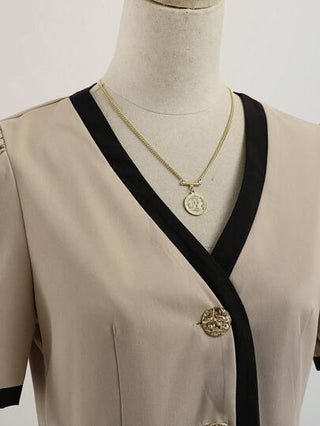 Franclia قميص نسائي للربيع والصيف، أناقة وعصرية لكل الأوقات، رقبة على شكل حرف V، خصر منتفخ، أكمام قصيرة، يزينها تريم ذو لون مضاد، أزرار معدنية سوداء، مناسب للعمل وأنشطة السيدات