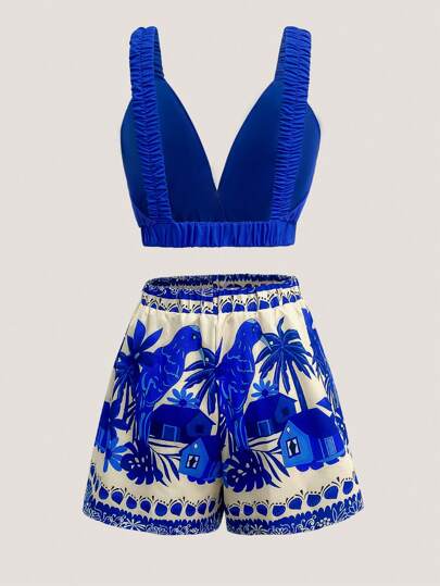 Franclia مجموعة سروال بطبعات نخيل و قميص بدون أكمام للنساء بألوان ثابتة مثالي للعطلة الصيفية