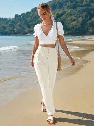 Frenchy سراويل كاجوال عادية عالية الخصر مزينة بأزرار للسيدات