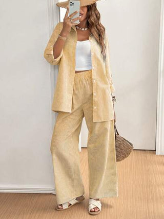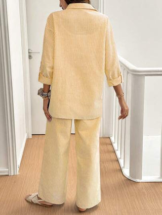 Frenchy مجموعة شتوية للنساء، بلوزة نسائية بأزرار وأكمام طويلة مقلوبة، وبنطال نسائي واسع الساق، طقم شتوي نسائي بقطعتين طويلي الأكمام