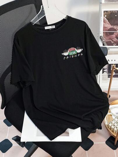 FRIENDS X تي شيرت أسود بياقة دائرية مطبوع عليه رسومات حرفية فضفاض عابر، مريح لفصل الصيف للنساء