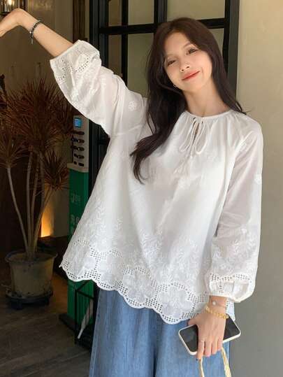 FRIFUL بلوزة إمبراطورية مطرزة بتفاصيل كشكشة على الياقة البيضاء للنساء، للربيع والصيف